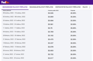 Názorný příklad navýšení u FEDEX, kde začátkem roku byl příplatek kolem 20%, dnes je to 42%: